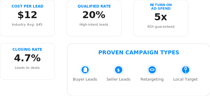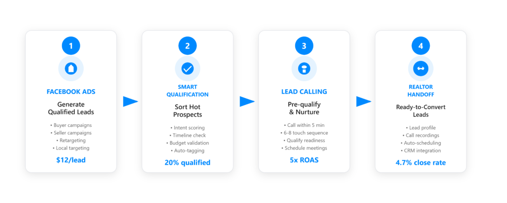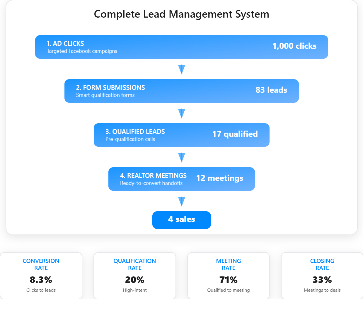Our Team Specializes In Creating High-Converting Facebook Ad Campaigns And Lead Management Systems Specifically For Realtors. Our 4-Step Process Will Help You Double Your Amount Of Deals And Cut By Half The Amount Of Time And Efforts Involved In Those Deals.